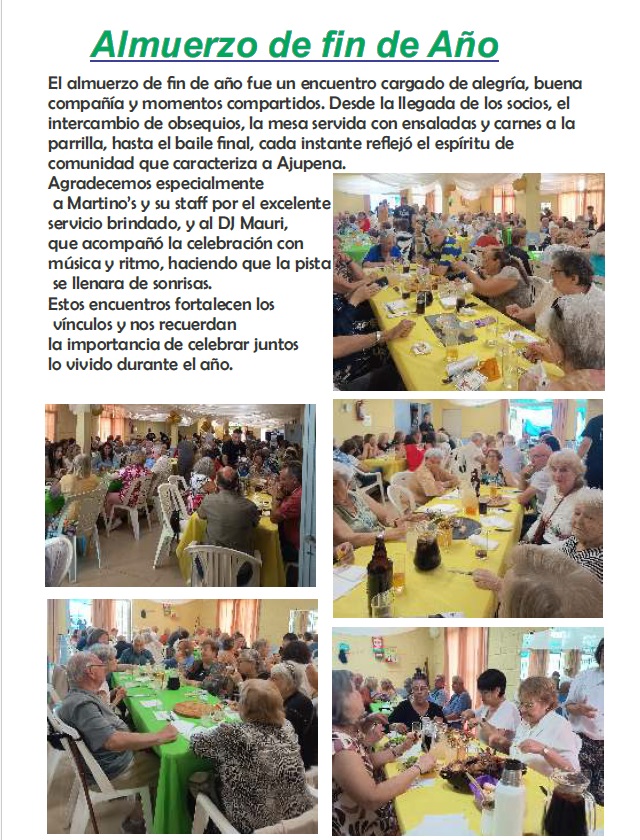 Inicio Eventos Almuerzo de fin de Año Eventos Almuerzo de fin de Año Por AJUPENA - 1 febrero, 2026 25 0 Destacados Cambio de Horario en Ajupena Destacados 1 diciembre, 2025 Boletines Mensuales 2025 Destacados 26 mayo, 2020 Espacio Radial Ajupena Destacados 18 febrero, 2020 Eventos Risoterapia en Ajupena Eventos 5 marzo, 2024 Almuerzo de fin de Año Eventos 1 febrero, 2026 1º de Octubre – Doble celebración: Día del Adulto Mayor y... Eventos 31 agosto, 2025 Noche Buena y Fin de Año en Ajupena Eventos 1 febrero, 2026