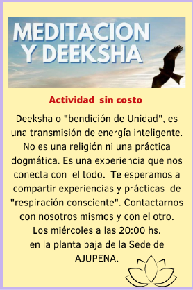 Inicio Sin categoría Meditacion Deeksha Miercoles 20.00 hs! Sin categoría Meditacion Deeksha Miercoles 20.00 hs! Por AJUPENA - 29 abril, 2024 156 0 Destacados Cambio de Horario en Ajupena Destacados 1 diciembre, 2025 Boletines Mensuales 2025 Destacados 26 mayo, 2020 Espacio Radial Ajupena Destacados 18 febrero, 2020 Eventos Almuerzo de Fin De Año Eventos 1 octubre, 2025 Actividad Física Para Adultos Mayores Eventos 2 abril, 2024 Viernes 28 y Sabado 29 Muestra De Fin De Año de... Eventos 31 octubre, 2025 Noche Buena y Fin de Año en Ajupena Eventos 1 febrero, 2026
